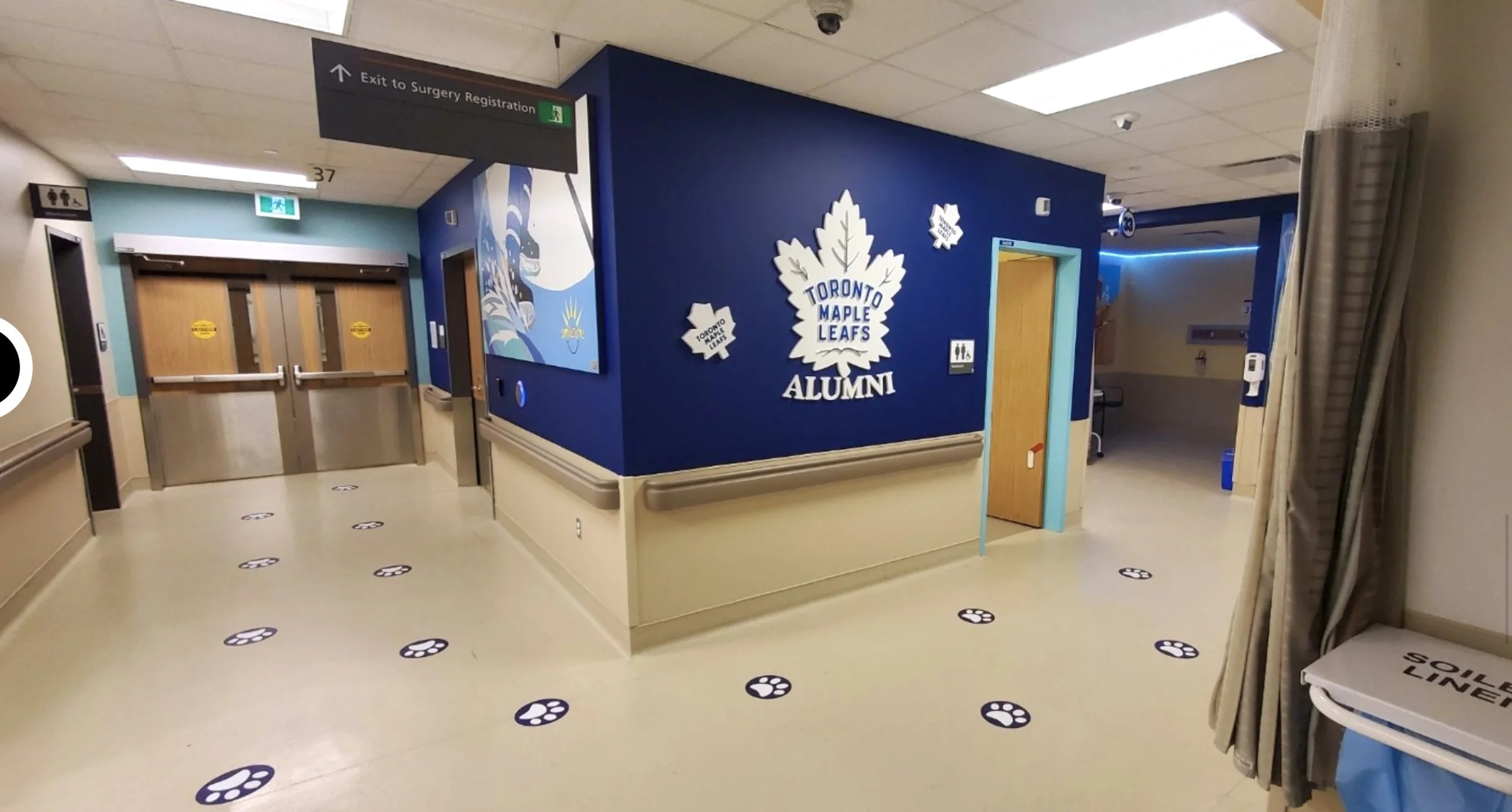 Toronto Maple Leafs installation at Humber River Hospital. Designed by Design Illusions, painted by Living Murals for a Smilezone transformation. Millwork by MBI.