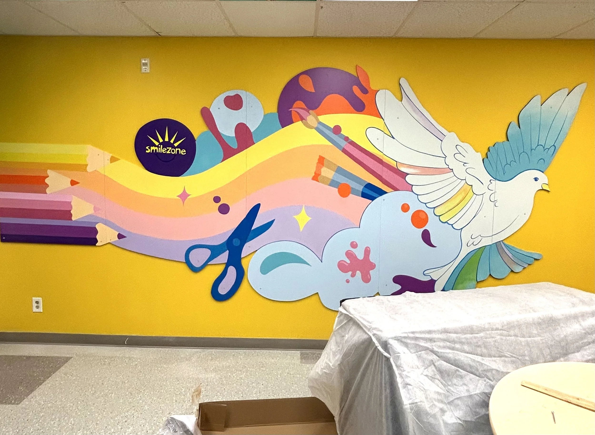 Imagination Creation Mural for Lynwood Charlton, Hamilton. Designed and painted for a Smilezone Foundation transformation. Millwork by MBI.