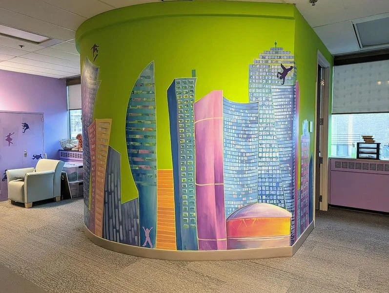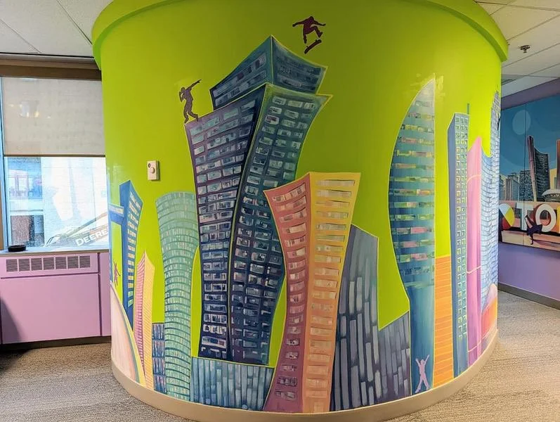 Cityscape mural on round wall in Toronto Smilezone